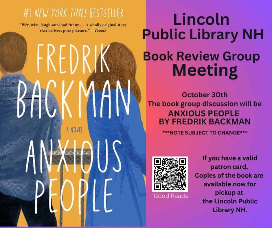 The Lincoln Public Library Book Review Group gathers at 6:15 PM on the last Thursday of each month, with the exception of July, August, November, and December, when we do not hold meetings. Our discussions take place in the meeting room, where we enthusiastically share our thoughts on the chosen book. We take turns sharing our insights and discussing various aspects, often enhanced by a short author interview or a review clip from YouTube. The library provides books through interlibrary loans from New Hampshire Libraries, and to borrow a book, you must be a library patron. We look forward to seeing you soon! Please note that the schedule is subject to change, and updates will be posted as necessary.