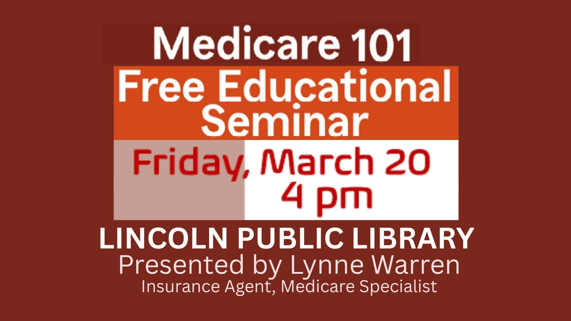 Join Lynne Warren for her workshop on Medicare 101 FREE Educational Seminar. Our experts can help you understand Medicare and your supplemental coverage options.