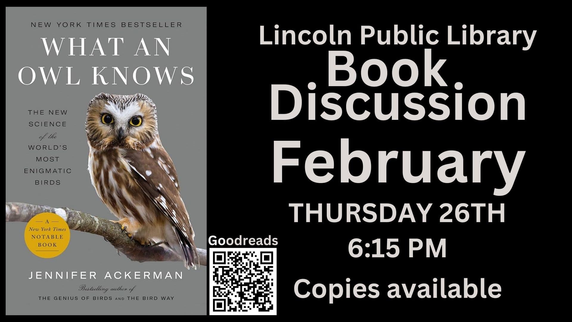 Get ready for a page-turning evening! The Book Review kicks off at 6:15 pm and wraps up by 7:30 pm. Head over to the Lincoln Public Library to snag your discussion books. Just make sure you’re a card-carrying member to check one out. Our delightful Rosz Lowen has picked the next read: “What an Owl Knows” by Jennifer Ackerman. Dive into this New York Times Bestseller for a hoot of a good time! Goodreads link https://www.goodreads.com/book/show/63024269-what-an-owl-knows