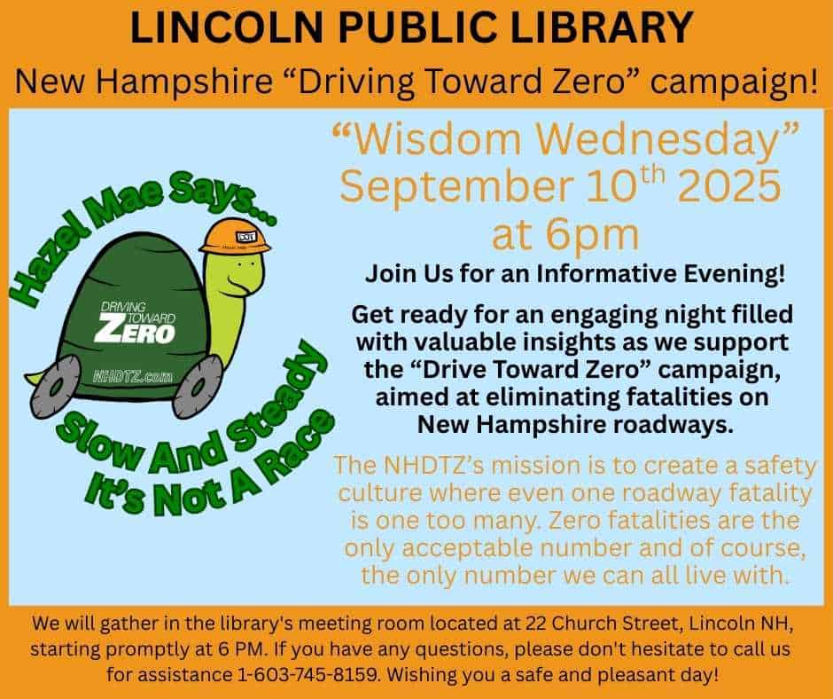 We will gather in the library’s meeting room located at 22 Church Street, Lincoln NH, starting promptly at 6 PM. If you have any questions, please don’t hesitate to call us for assistance 1-603-745-8159. Wishing you a safe and pleasant day!